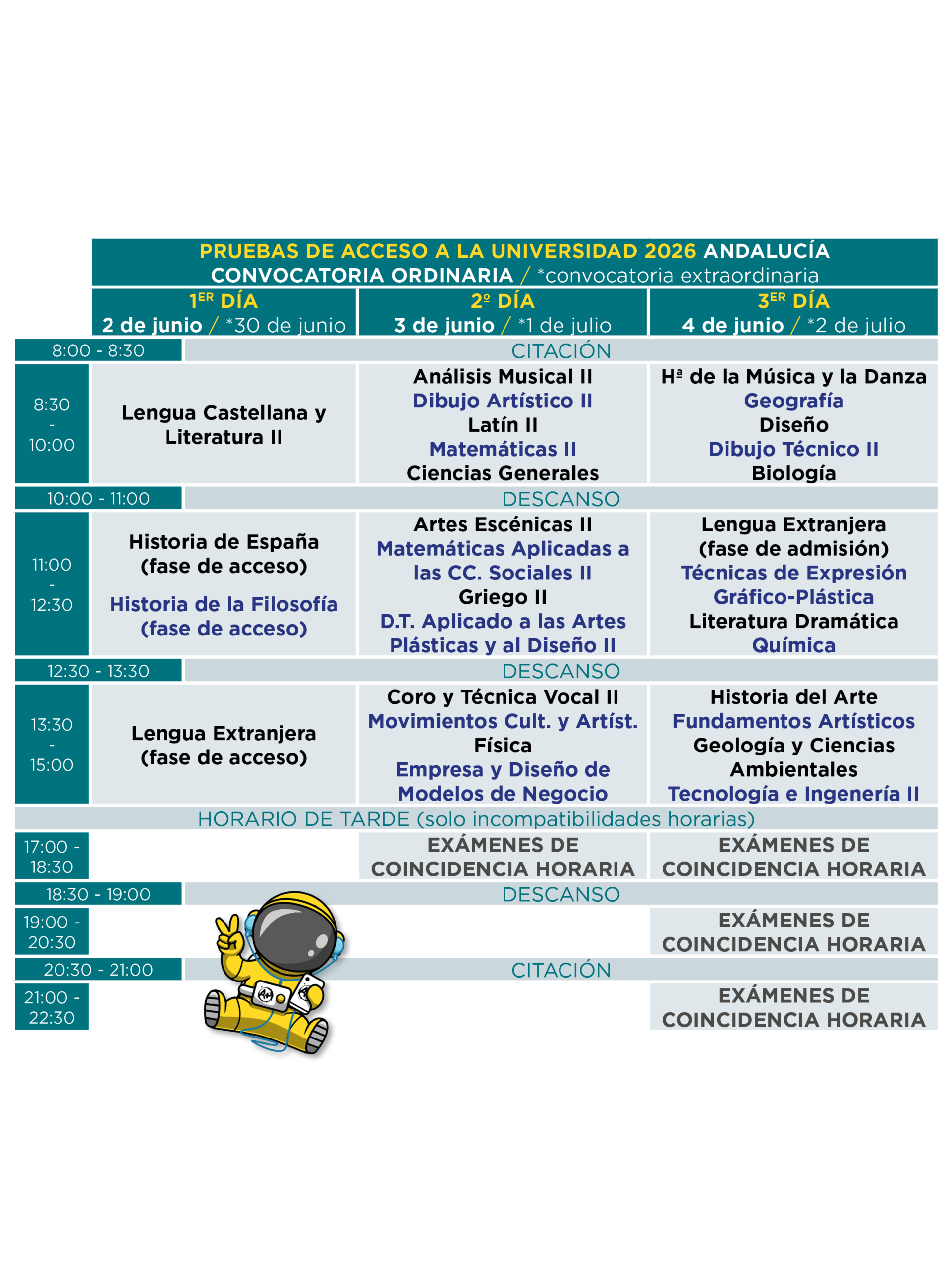 Horario de Selectividad Andalucía 2026